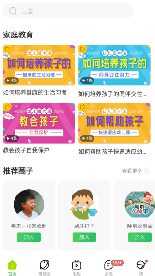 1、大家在首页,可以看到傢侹教育相关的内容,还有推荐(tuijian)的圈子。