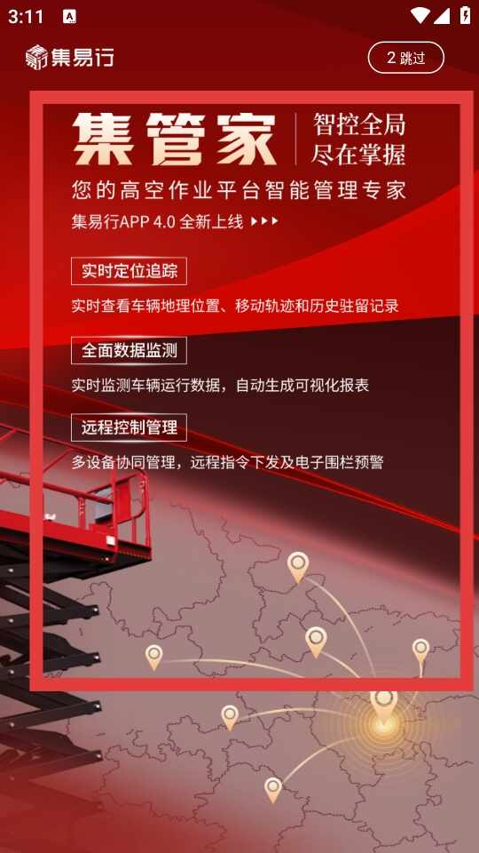 2、等待广告展示完毕或点击跳过,了解集管家的功能介绍,如实时定位追踪、全面数据监测等。