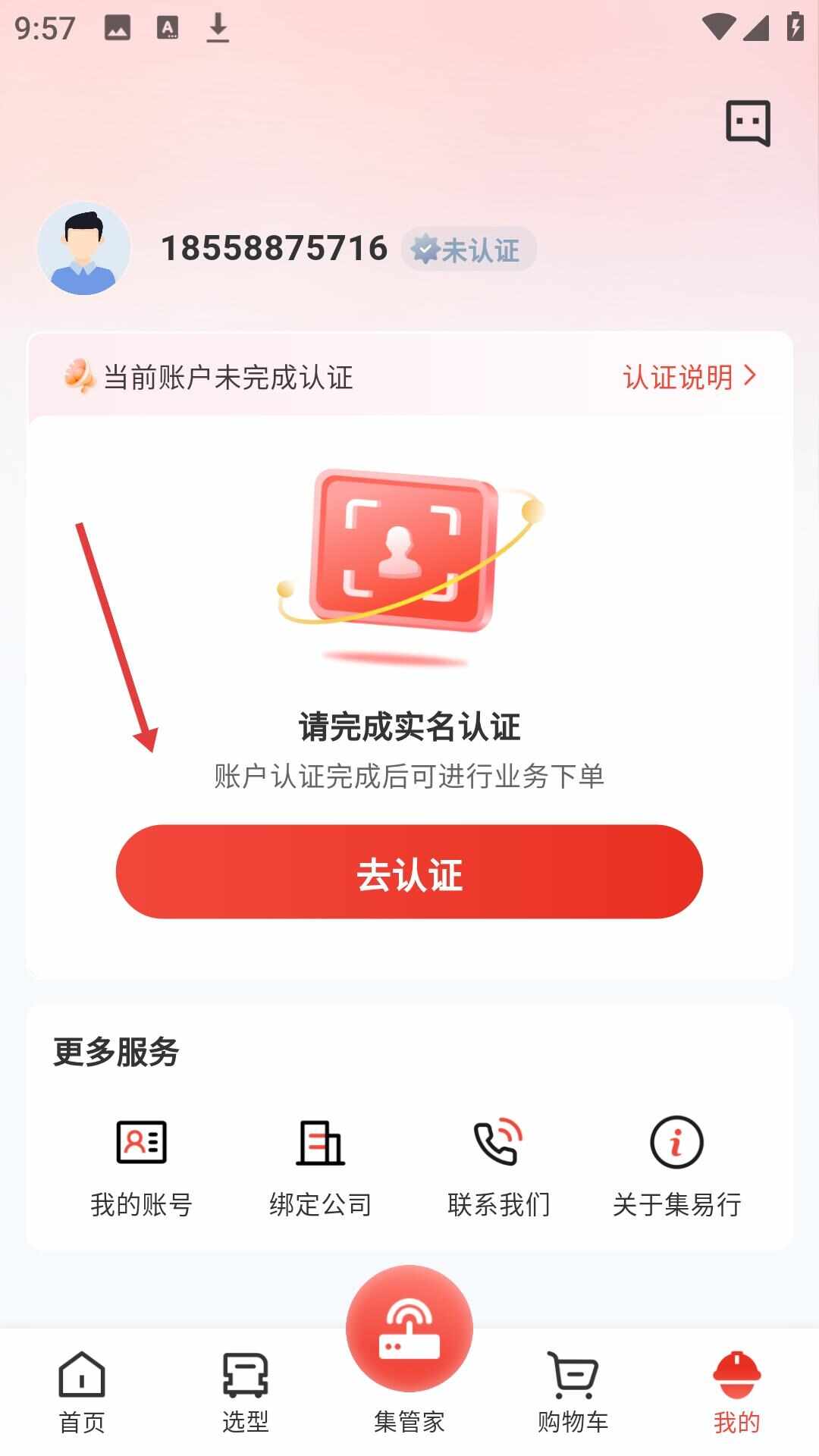 3、打开集易行APP,点击我的進入个人页面,若账户未认证,点击去认证按钮,按提示完成实名认证以开展业务。
