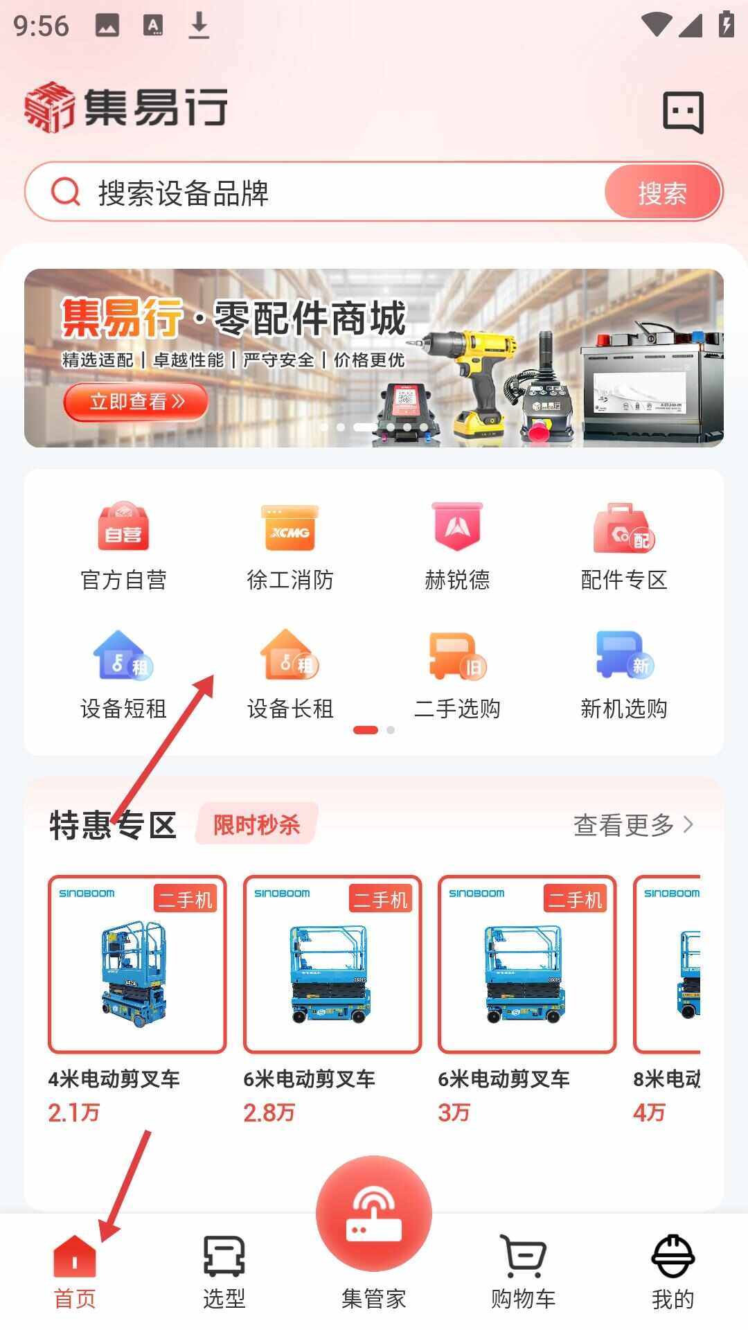 4、進入首页,可搜索设备品牌,浏览官方自营、配件专区等板块,查看特惠专区的设备信息,进行相关操作。