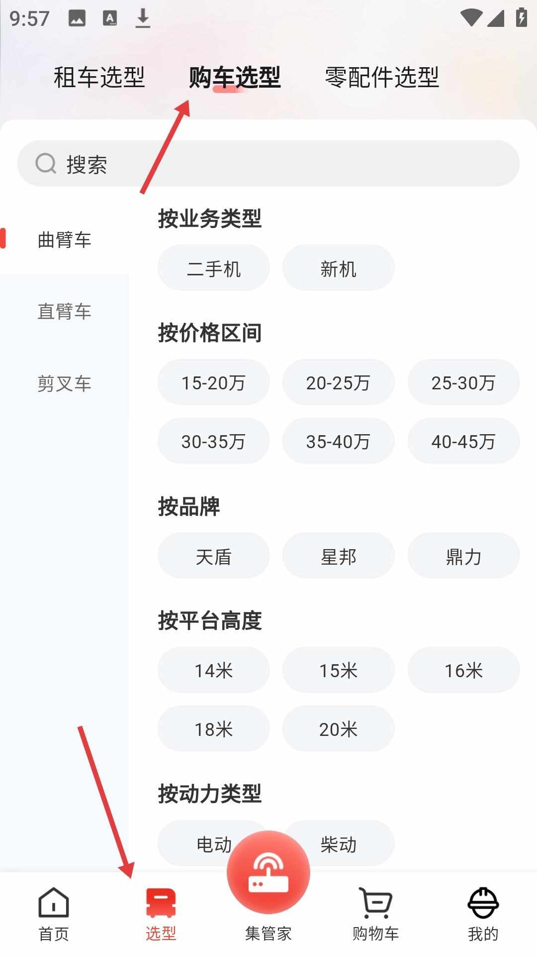 2、進入集易行APP的选型页面,选(xuan)择(ze)购车选型,就能按照(zhao)业务类型、价格区间等多种(duozhong)条件来筛选心仪的车辆。