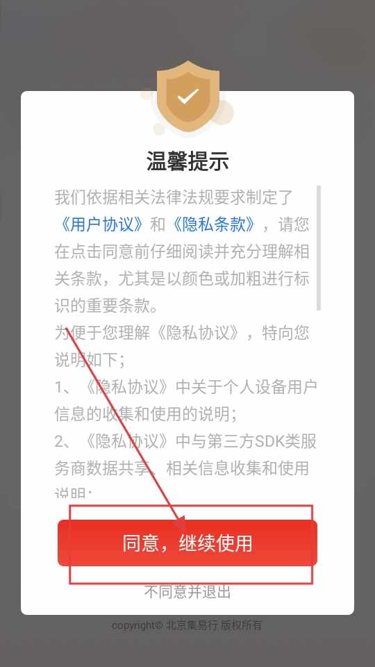 1、点击同意继续使用,阅读并同意用户协议和隐私条款,進入下一步操作。