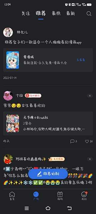 3、进入“广场”,可以看到同样(yang)使用(shiyong)星夜影视的小伙伴们推荐的好剧,还可以和关注好友(you)(friends)进行互(hu)动聊(liao)天(tian),点赞评(ping)论。