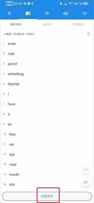 7、选择达成后,在我的单词界面中点击开始学习就可以学习到该课本中的所有单词了。