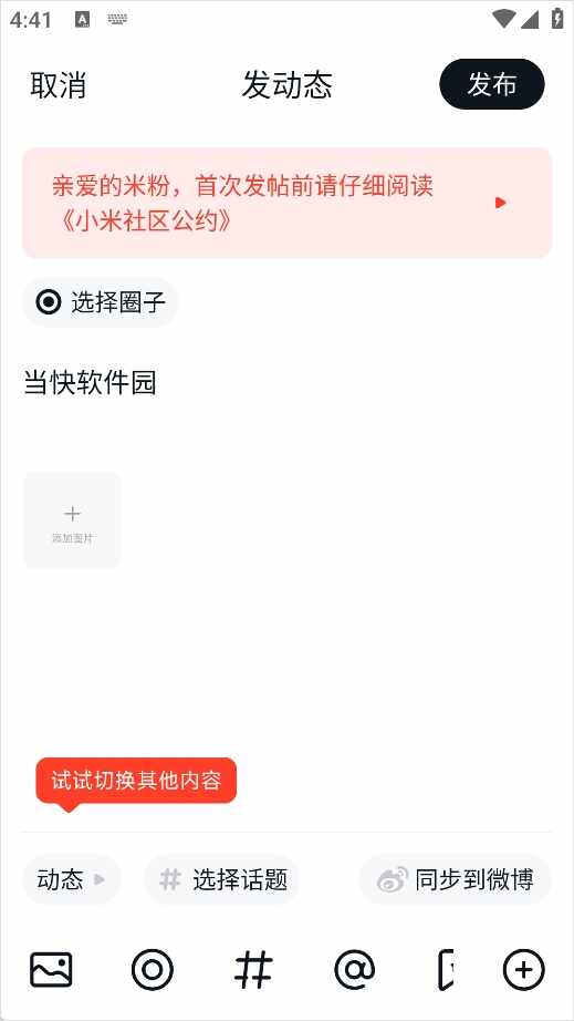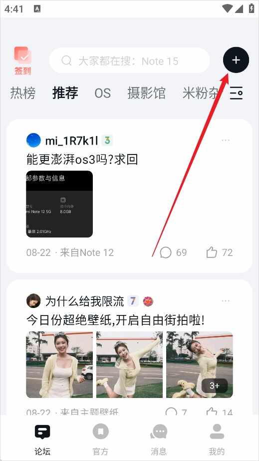 1、打开(kai)(Open)小米社区App,点击右上角的“+”按钮;