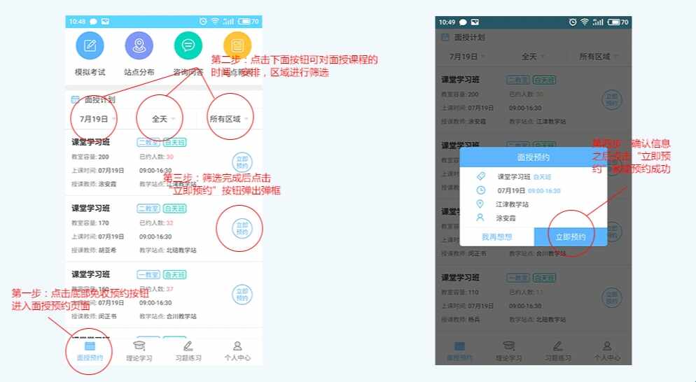 第一步:点击底部免收预约按钮,进入面授预约界面