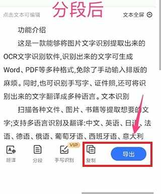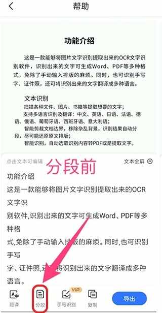 1、用户在进行文字扫描之后,会自动生成文档,但是它会按照图片上的文字模式进行排版,用户可以点击下方的“分段”,即可进行分段排版。