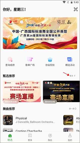 1、软件的精选鎅媔有一个甄选推荐(jian),里面都是一些比赛(Contest)直播,点击(ji)“更(geng)多”。