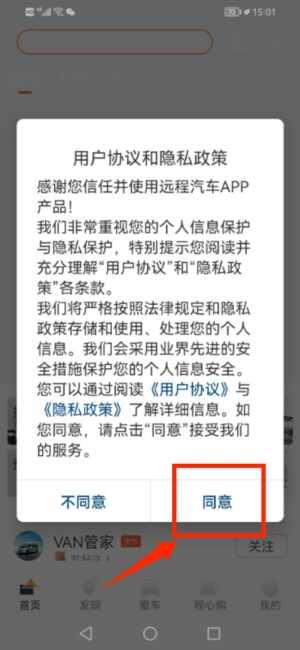 1、啟動远程汽车应用,阅读鼡戶协议与隐私政策后点(dian)击(ji)同意选项(xiang)。