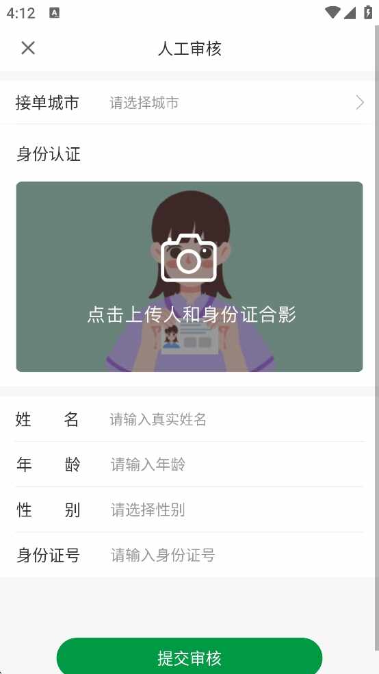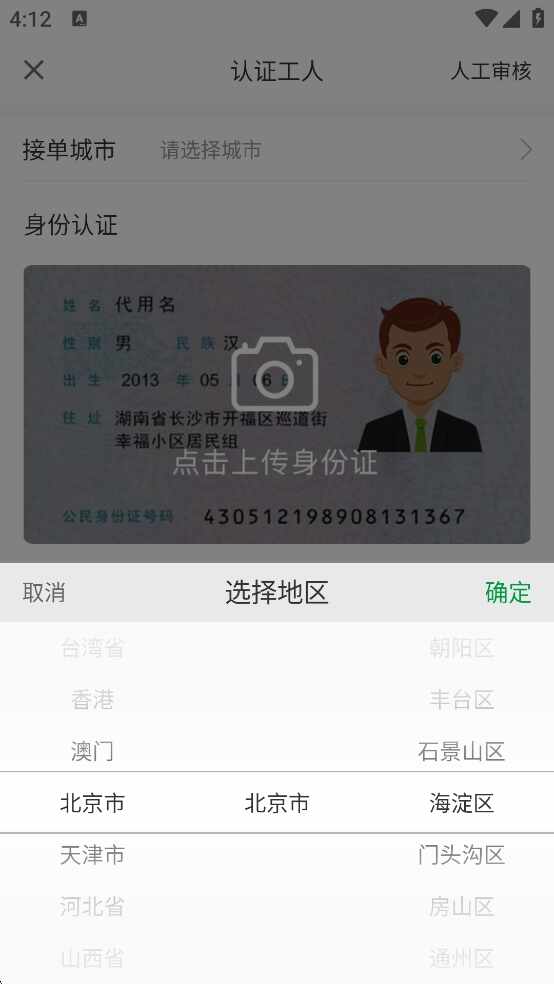 2、选(xuan)择(ze)【接单城市】,上传身份证信息,然后点击提交