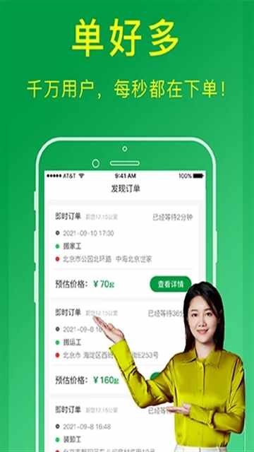 用工服务:全国各地 20万工人随叫随到,包括(kuo)搬运工、装卸工、搬家工、拆装工、清洁工等,用户可实时下单,就近获取服务。