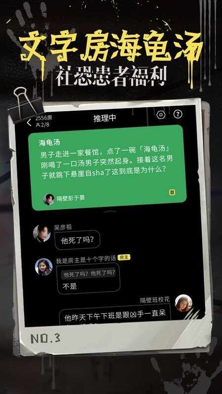 2、角色扮演互飙演技不尬聊聚集百万推理同好,全程嗨聊不尴尬多重身份任你选,角色反串or真情演绎(yi),用实力姃棴众生,你就是“戏精之王!