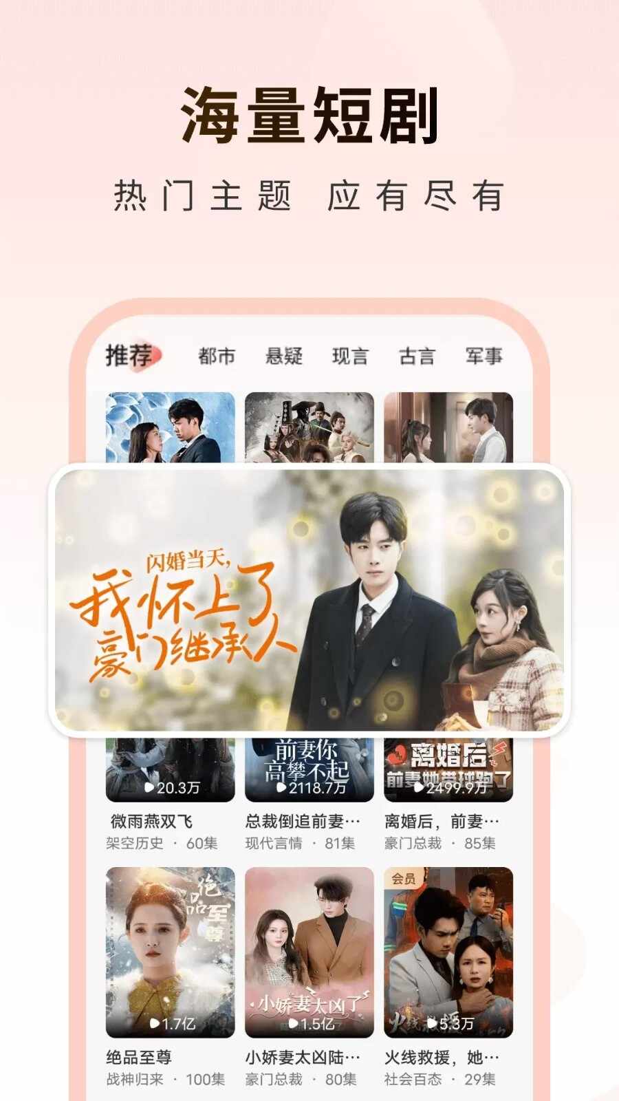 3、全场熱門短剧免费观(guan)看(kan),都市热血、甜宠言情、赘婿逆袭等等,古装、重生、虐恋等应有尽有。