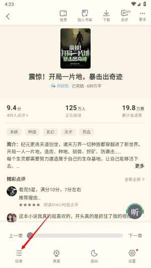 3、在阅读界面点击中间区域呼出菜单,点击左下角的"目录"。