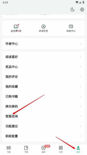 2、如图所示,然后在我(wo)的页面点击"客服(kefu)咨询"进(jin)入。