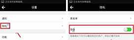 2、接着在设置页面中点击【隐私】,在隐私页中打开【隐身】功能开关即可。(如下图)