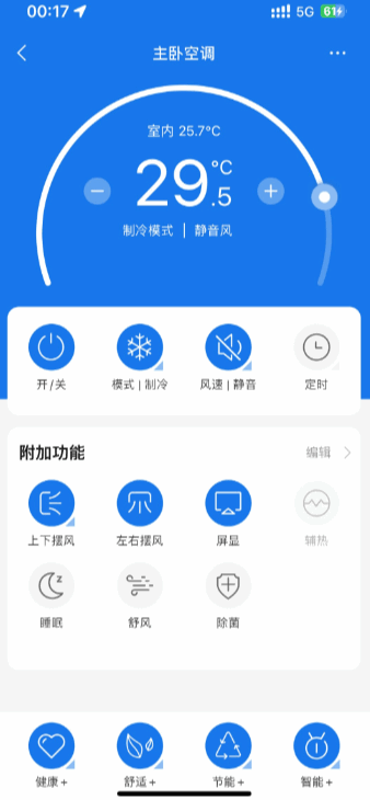 远程控制:阔以隨時隨地经过手机控制空调的开关、温度调节、模式切换(制冷、制热等)、风速和风向调整。