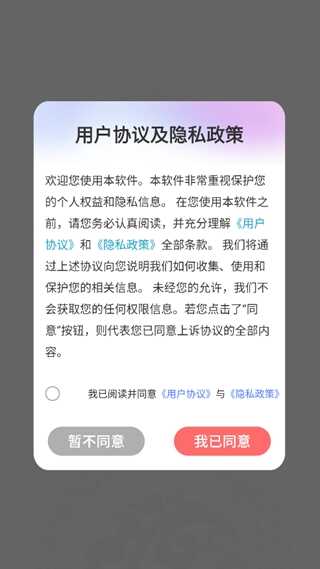 1、下载并安(an)装(zhuang)后打(da)开软件(ruanjian),阅读用户协议及隐私政策,点(dian)击我已同意,進入下一页面。