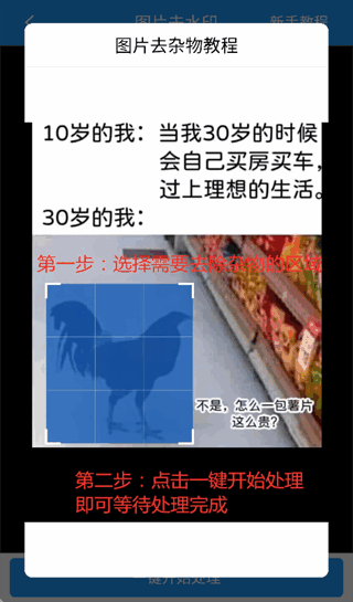 3、查看教程,取舍好要去除的范(fan)围,点击一键开始处理(deal with),完(wan)成后导出照片就阔以了。