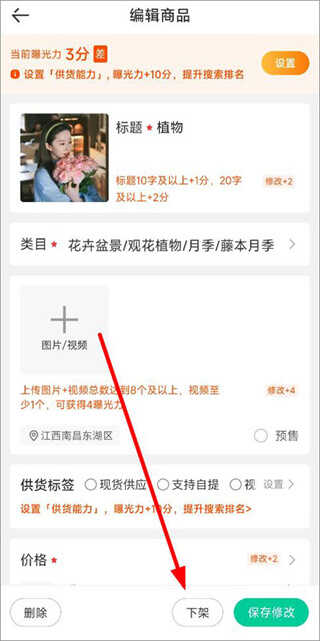 4、进入商品编辑页面,用户可修改商品的类目、添加照片/视频、修改供货标签、设置价格,点击下方下架即可下架商品。