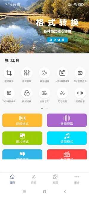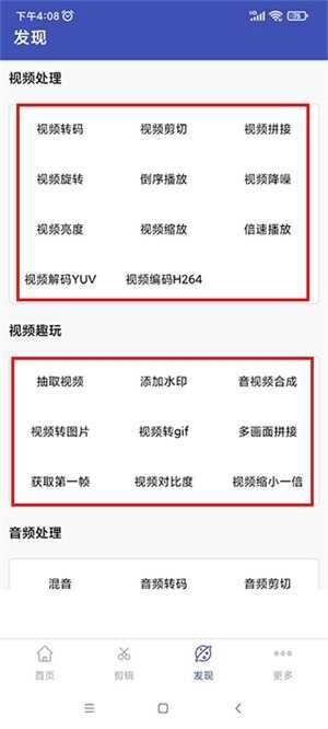 3、在发现这栏,拥有视频转码、视频剪切、添加水印、视频传图片、视频转gif、音频转码、抽取音频、图片转视频等几十种功能。