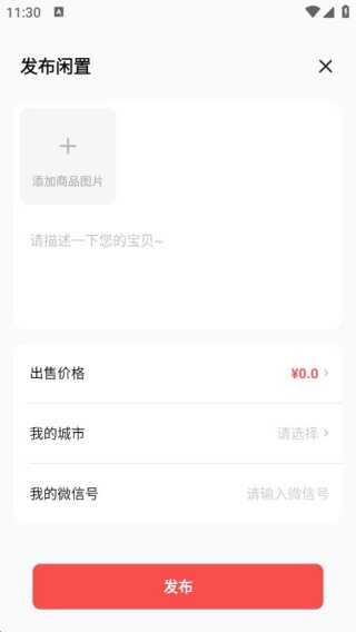 3、闲置发布功能,支持(support)添加商品图片、设置出售价格,配合(Cooperate)详细描述引導,帮助用户高效发布闲置物品。