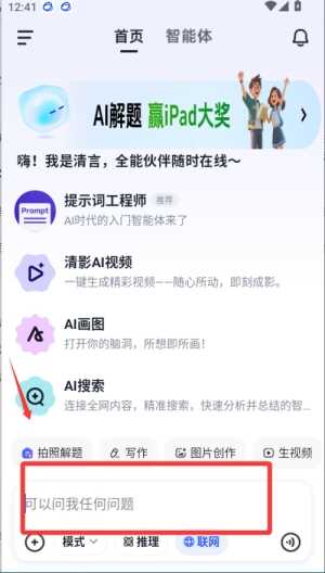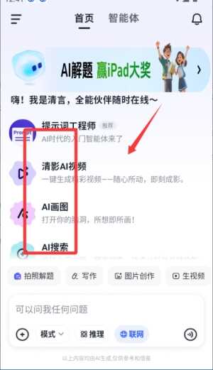 1、打开智谱清言ai应用,在主界面选择你需要使用的功能,比如文本生(sheng)成或代码编写。