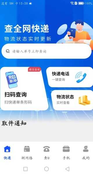 1、进入软件后,你阔以看到首页里有扫码查询、快递电话和物流状态等功。