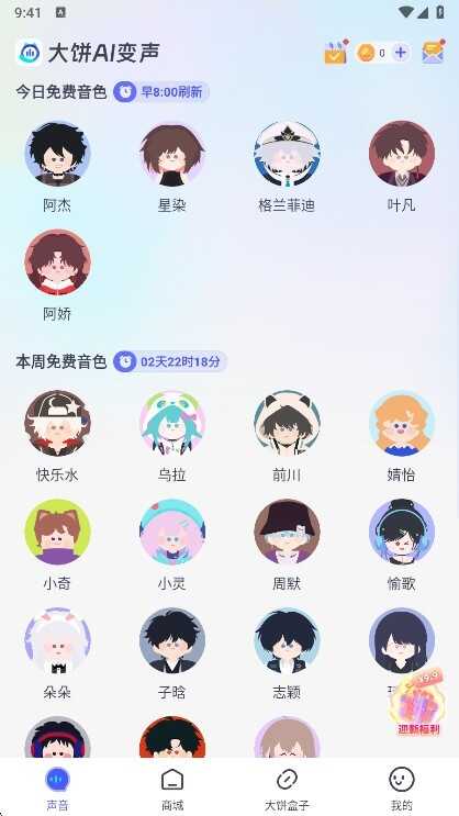 1、打开进入安装好的大饼AI变声,用户在首页可以看到各类支(zhi)持使用的音色