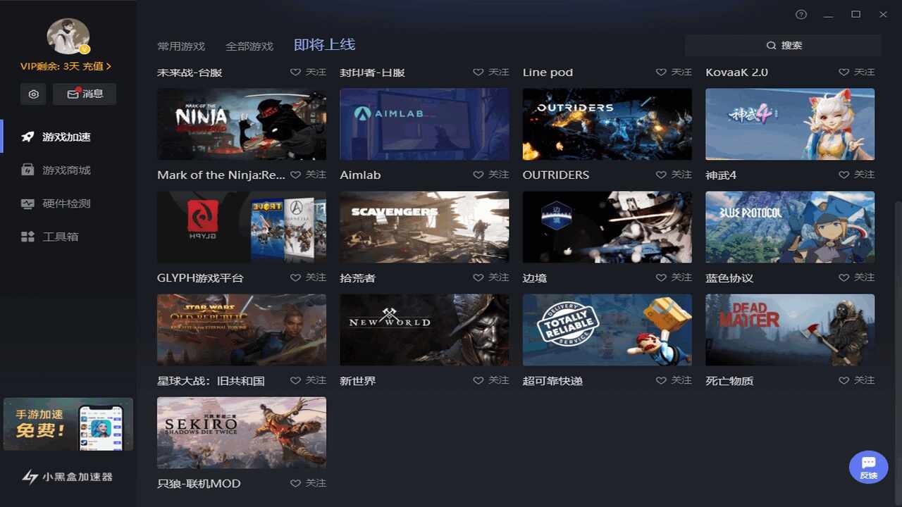 小黑盒手游加速器(小黑盒手游加速器交流群)帮助用户能一键加速游戏网络,帮助用户能体验最流畅的游戏感受。加速器可以实时的显示对局的网络和性能详细数据,小黑盒手游加速器破解版用户只需要接入互联网,就可以选择不同的加速器模式,大家可以参考一下小黑盒手游加速器的内容。