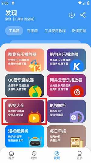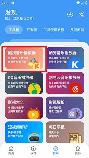 1、点击发现板块,点击酷我音乐播放器。