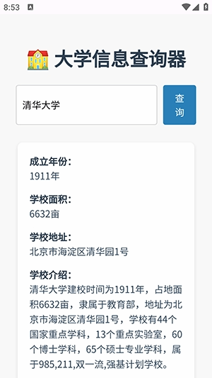 大学信息一键查最新手机版(大学生信息查询系统)能查询全国高校的招生信息、历年录取分数线、专业详情、师资力量和就业前景等核心报考相关内容,软件完全免费使用,直接在搜索框中快速输入大学名字即可快速查询,搜索结果包含信息均来自互联网,同时还提供了地址等相关信息可以精准查看,下面是相关内容介绍。