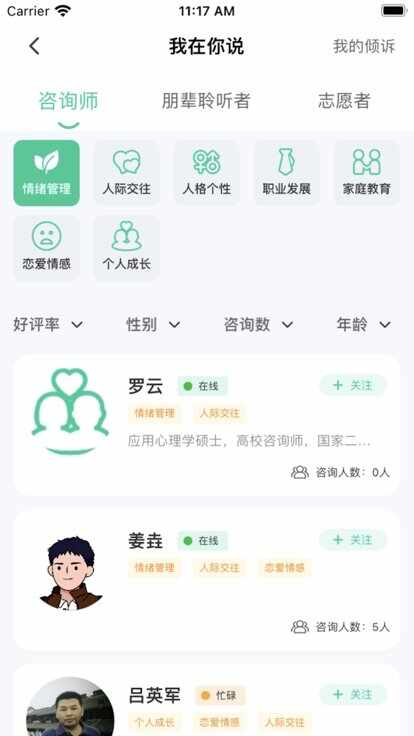 4、一批高素质的咨询师为用户提供服务,为用户提供优质的心理咨询服务。