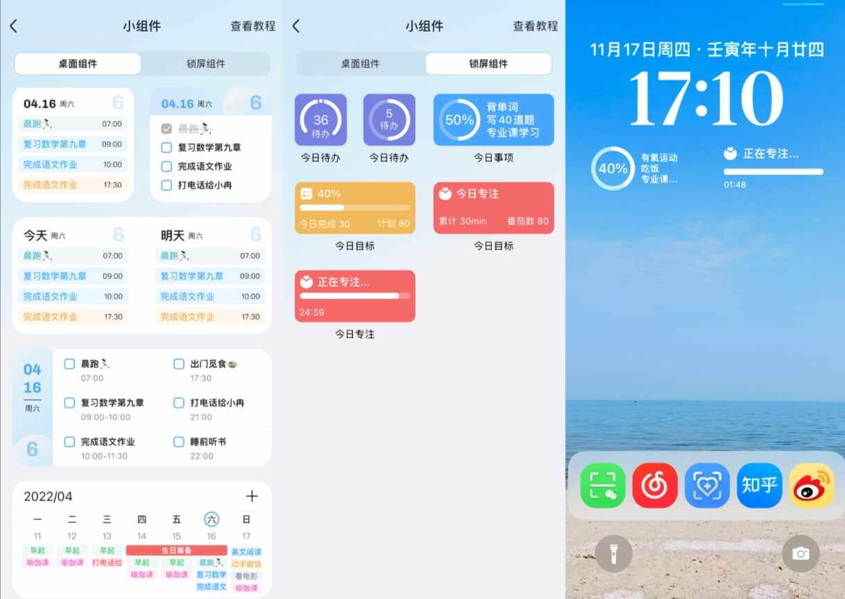 5、锁屏小组件、桌面小组件:怕忘记任务的还可以将一些任务放在(put on)锁屏或者桌面上,每次打开就能看到(kandao)今日还没有完成的事情,在打开番茄钟专注的时候,锁屏实时显示专注时长。