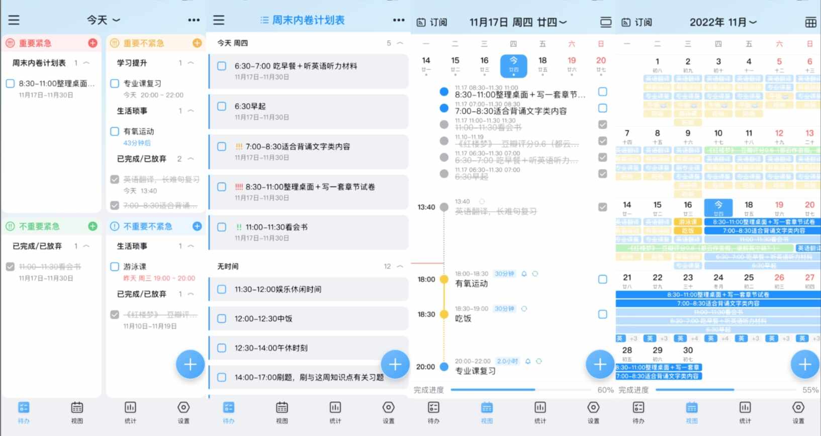3、多维度视图:有四象限、日程表、周计划、月计划,可以根据自己的习惯多维度查看任务,我最喜欢的还是四象限和日视图,每天重要(yao)的(de)事情和时间节点一目了然展