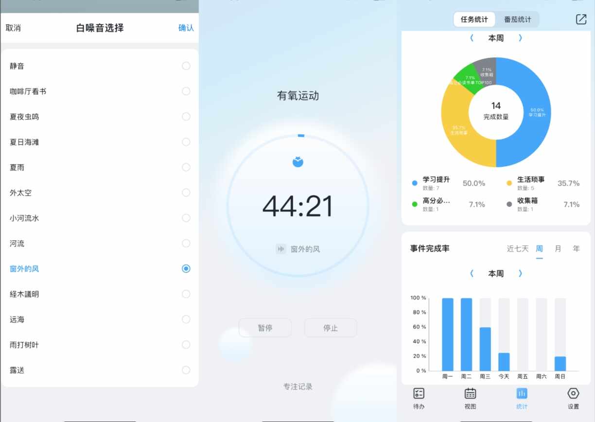 4、番茄专注时钟,這個就是专注必备的功能了,根据自己的任务可以自定义专注时长,还能打开白噪音一起配合使用。唯一的缺点可能(keneng)就是不能强制锁机。