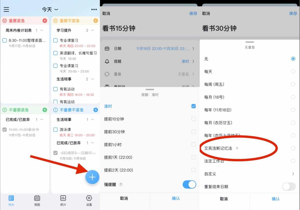 1、创建待办事项:这是氢时光最基本的功能,点击+号就能快速创建各种事项。可以设置单日、跨天、提醒、四象限、重复各种任务。设置重复里有一项是艾宾浩斯记忆法,背单词/记知识点就用它。