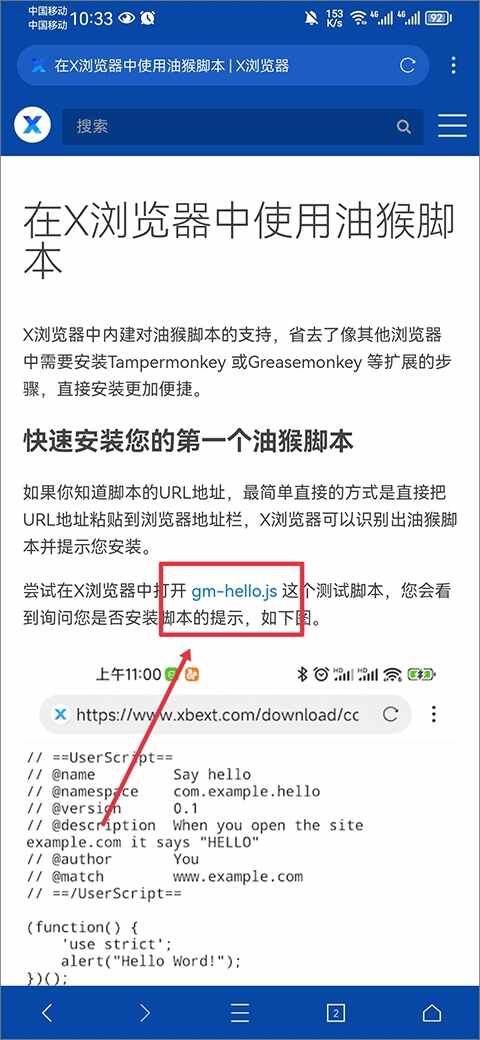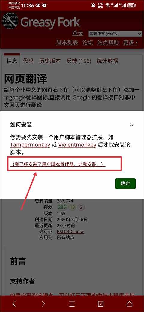 2、第一次安装脚本的时候站点会弹出one个对话框,因为X浏览器已经内置了脚本管理器无需安装第三方扩展,所以(so)直接点击“我已经安装了用户脚本管理器,让我安装”。