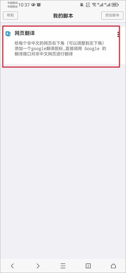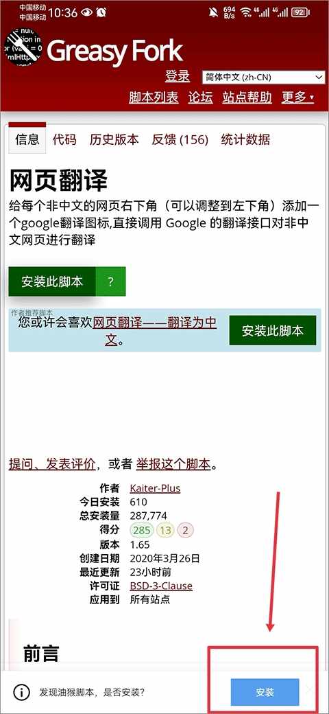1、我们以网页翻译(translate)这个脚本为例,打开脚本详情页,直接点击””安装此脚本””按钮。