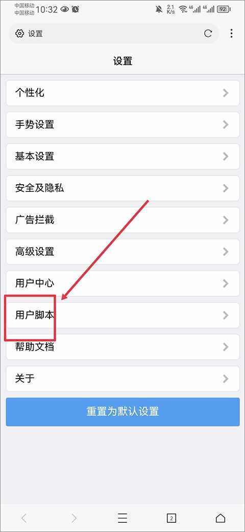 4、脚本安装成功后,我们可以在用户脚本的管理界面 (浏览器设置》用户脚本 )看(kan)到(dao)刚刚安装的脚本。