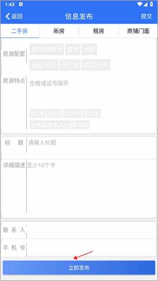 3、這是1个房源信息表,填写你要发布的房子具体信息,填好后点击下方的“立即发布”,等待一会儿首页页面(yemian)就会显示你发布的房源信息。