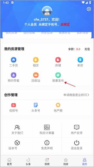 1、輸入手机号和验证码登录软件,默认进入到首页,会很多房源可以查看,切换到“我的”,选择我的房源管理中的(zhongde)“我要发布”。