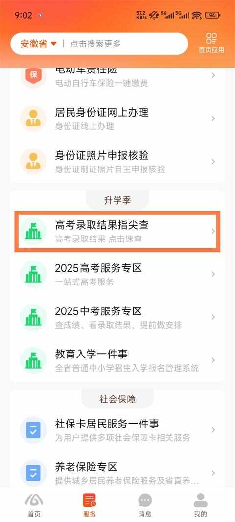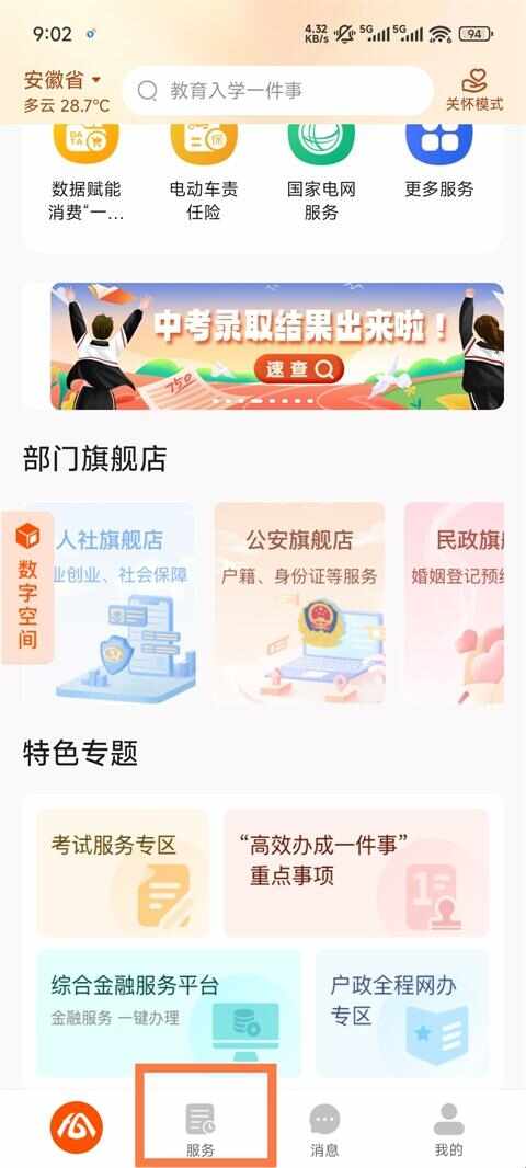 1、打开皖事通App,点击服(fu)务(wu)板块