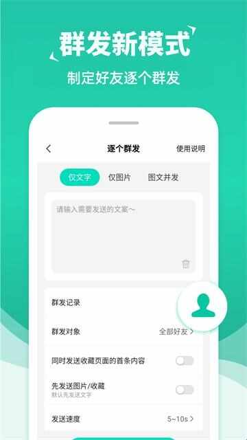 2、界面清爽(refreshing)无广告,群发流程(process)仅需“挑对象-设置参数-点击发送”三步,新(xin)手(shou)也能(can also)(yeneng)快速上手。
