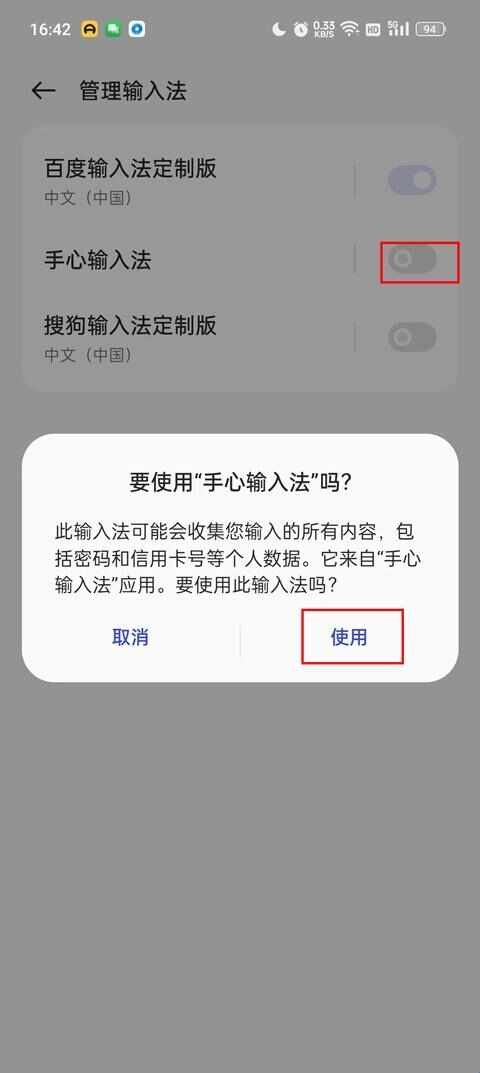 2、进入到输入法管理(guanli)页面,点击打开手心输入法的使用;