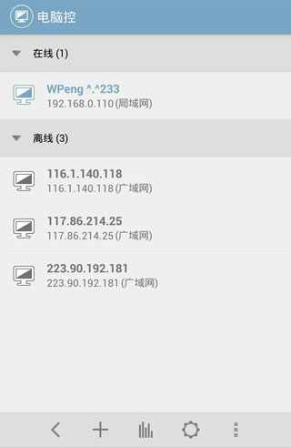 1、打开电脑端软件,然后打开手机上的手机端软件,手机会自动搜索出局域网内打开了电脑端软件的电脑,并显示在在线列表中,如果没能搜索出电脑,请点击屏幕下方的添加按钮,手动添加。