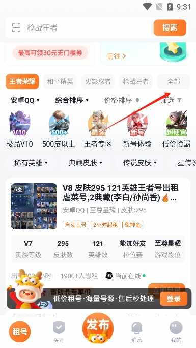 1、海量的账号信息,在线一键租赁各种游戏账号,十分的便捷化。