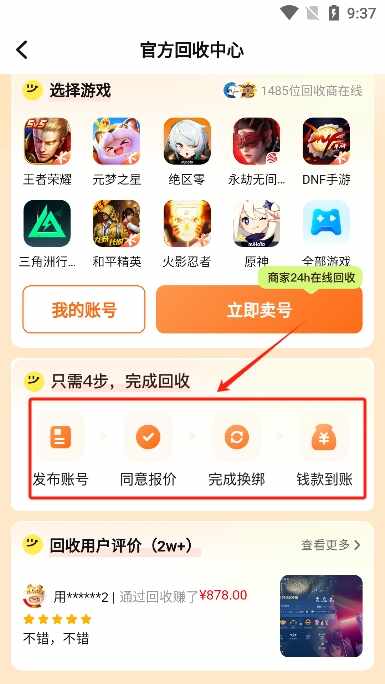 4、只需要简单的四步:发布账号、同意报价、完成换绑、钱款到账。就能够快速完成回收