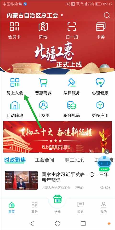 1、打开并登录北疆工惠app,进入首页点击【码上入会】(下图绿色箭头所指区域)