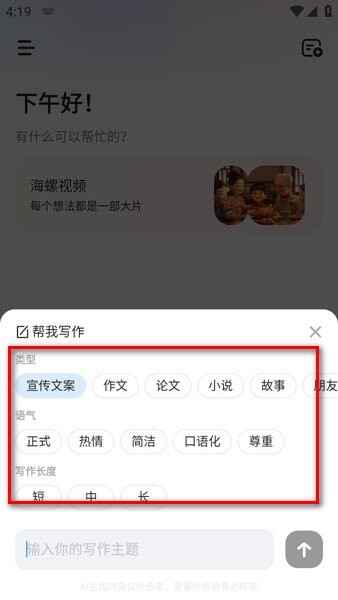 如果需要写作内容,就点击底部的“帮我写作”,并选写作类型、语气、写作长度等,输入写作主题就可以生成;